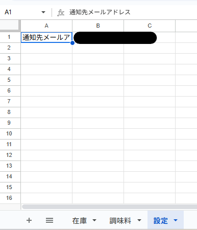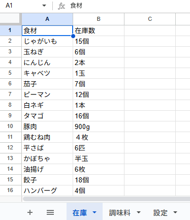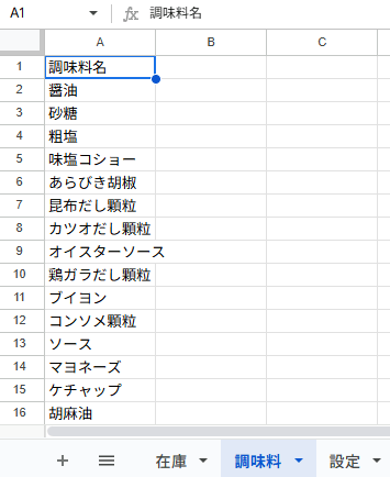 シート2に「調味料」という名前をつけ、A列のヘッダー(A1)に「調味料名」を設定します。 - 冷蔵庫にある食材や調味料をリストアップし、在庫数を入力します。