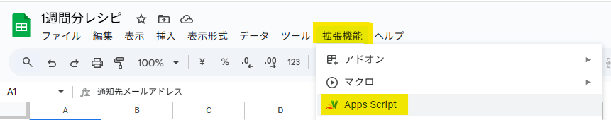 - スプレッドシート上部のメニューから「拡張機能」→「Apps Script」を選択し、スクリプトエディタを開きます。