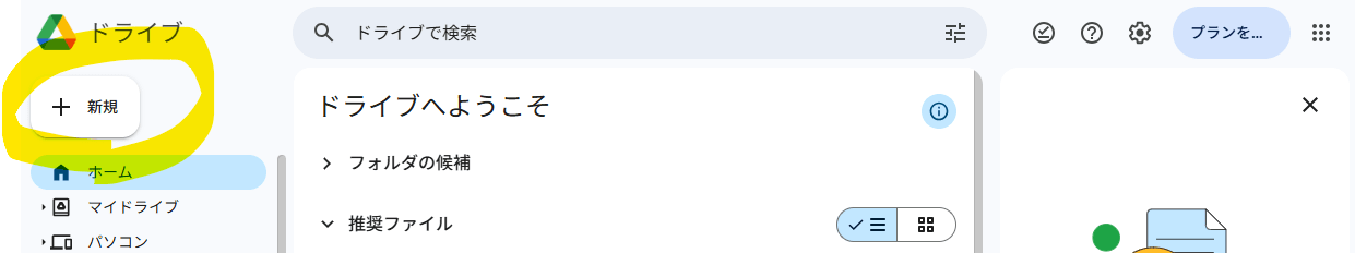 - Googleドライブを開き、「新規」からGoogleスプレッドシートを作成します。
